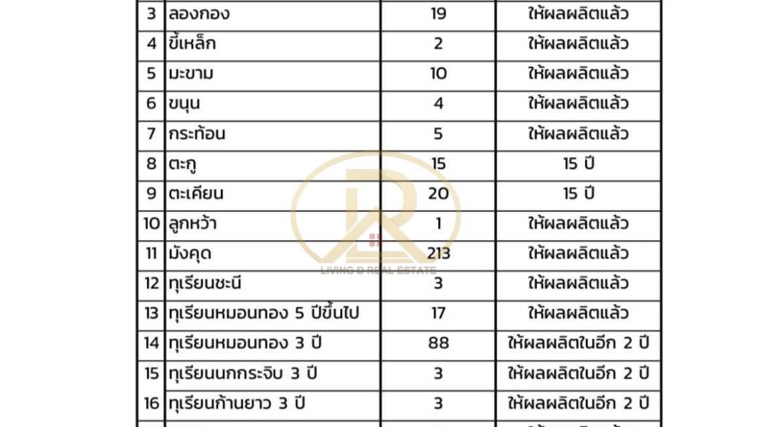 • พื้นที่ที่ดินเป็นสวนผสม มีผลไม้เต็มพื้นที่ พร้อมให้ผลผลิต มังคุด ทุเรียน และอื่นๆ(ตามรายการที่แสดงในเอกสารแนบ)